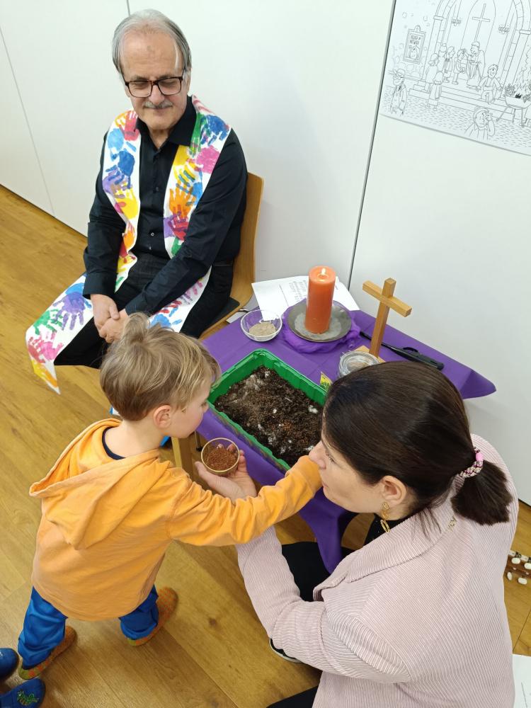 Am Aschermittwoch besuchte uns Pfarrer Josef im Kindergarten zur Aschenkreuzauflegung. Zum Abschluss der Feier streuten die Kinder Kressesamen in die Erde, die wir zuvor mit Asche vermischt hatten. Die Asche verlieh den Samenkörnern Kraft zum Wachsen und wir konnten schon bald leckere Kresse-Brote genießen.