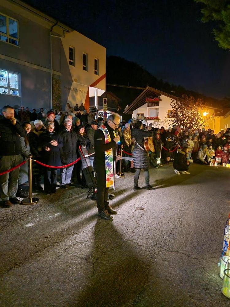 Im Anschluss daran versammelten sich alle vor dem Volksschulgebäude. Dort sangen die Kinder weitere Laternenlieder und auf die Volksschule wurde ein Video der Vorschulkinder projiziert, die die Geschichte vom heiligen Martin erzählten. Außerdem erteilte Pfarrer Josef allen Anwesenden seinen Segen.